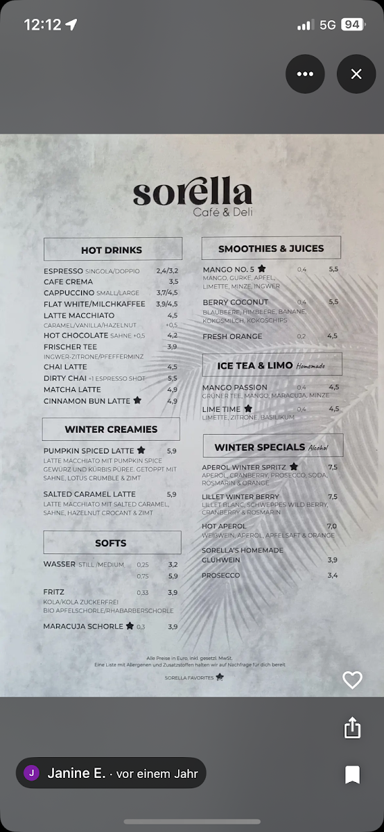 Introducing the menu at Sorella - Hochstraße 48 is a delightful journey through wholesome and vibrant flavors. Nestled in Gelsenkirchen, this charming spot has quickly become a favorite for brunch enthusiasts and health-conscious diners alike. Customers rave about the breakfast wrap that, though a bit under-seasoned, offers a satisfying start to the day. The vegan cinnamon rolls are a sweet highlight, while the refreshing mango drink, falafel, and salads showcase the restaurant's commitment to fresh ingredients and neat presentation.